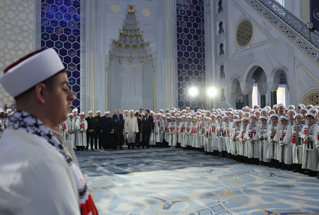 Başkan Recep Tayyip Erdoğan, Çamlıca Camisi'nde, imam hatip okulları ile Kur'an kurslarında hafızlık eğitimlerini tamamlayan öğrencilerin tekbirleriyle karşılandı.