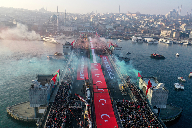 Eylemi teknelerden takip edenler de meşaleler yakıp Türk ve Filistin bayrakları salladı. Geniş güvenlik önlemlerinin alındığı köprünün ortasından geçen tramvay yolunda Türkçe ve İngilizce "Gazze'deki Soykırımı Durdurun" yazılı dev pankart ile Türk ve Filistin bayrakları açıldı. Yürüyüşte, "Dün Ayasofya, Bugün Emevi, Yarın Aksa, Bir Güneş Doğuyor" yazılı pankart da taşındı.