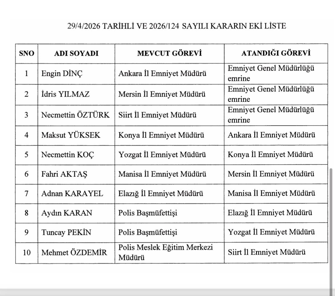 Listede yer alan bilgilere göre, bazı il emniyet müdürlerinin görev yerleri değiştirilirken, bazı isimler de Emniyet Genel Müdürlüğü emrine alındı.