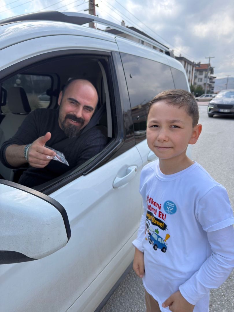 Etkinlik kapsamında öğrenciler, üzerinde projenin sloganının yer aldığı oto kokularını sürücülere hediye ederek trafikte nezaketin önemine dikkat çekti.