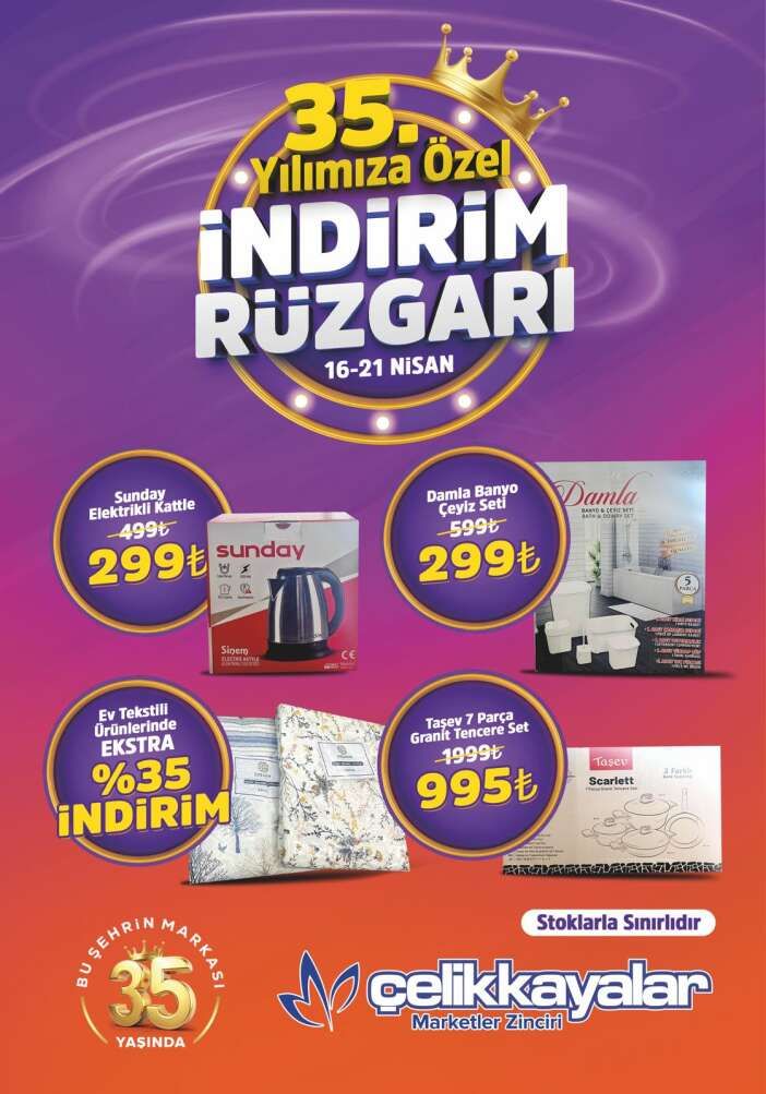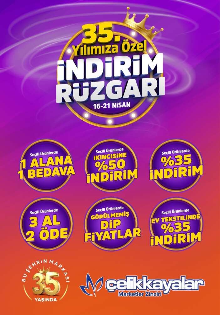 Konya’nın köklü market zincirlerinden Çelikkayalar, kuruluşunun 35. yılını müşterilerine özel hazırladığı geniş kapsamlı indirimlerle kutlama kararı aldı. Belirli tarihler arasında geçerli olacak kampanya, alışveriş yapanlara avantajlı fırsatlar sunuyor.
