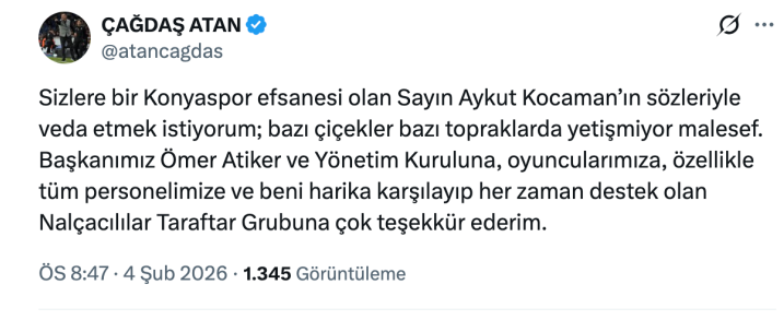 Çağdaş Atan, sosyal medya hesabından yaptığı paylaşımda Konyaspor’un unutulmaz isimlerinden Aykut Kocaman’ın sözlerine atıfta bulunarak, “Bazı çiçekler bazı topraklarda yetişmiyor maalesef” ifadelerini kullandı. Bu sözler, Atan’ın ayrılığa dair mesajının en çok konuşulan bölümü oldu.