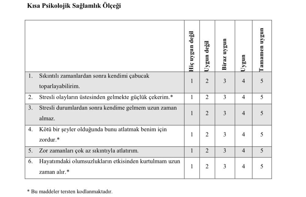 Psikolojik sağlamlık zorluklara uyum sağlayarak hem zihinsel hem de ruhsal olarak zorluklarla baş edebilme becerisi geliştirebilmektir. Stresle baş edebilmek için psikolojik sağlamlığımızı geliştirmemiz gerekir. Aşağıda psikolojik sağlamlığınızı ölçmeniz için ölçek paylaşıyorum. Ölçekte 2, 4, ve 6. maddeler tersten kodlanmaktadır. Tersten kodlanan maddeler çevrildikten sonra alınan yüksek puanlar yüksek düzeyde psikolojik sağlamlığa işaret etmektedir.