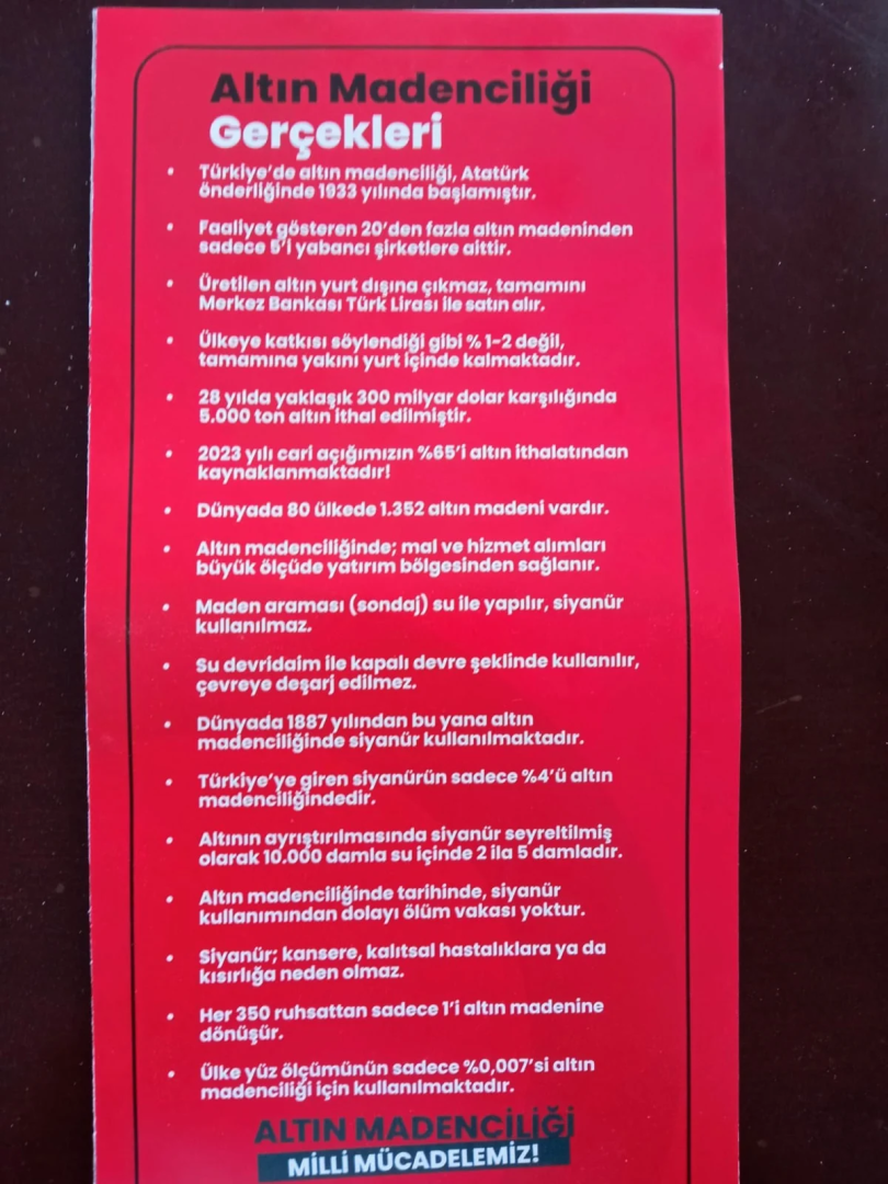 Cengiz’in bastırıp dağıttığı broşürde altın madenciliği ve siyanürlü işlemler savunuluyor. Atatürk’ün fotoğrafına da yer verilerek Ulu Önder’i milli politikaları istismar ediliyor. Broşürde şöyle deniliyor: