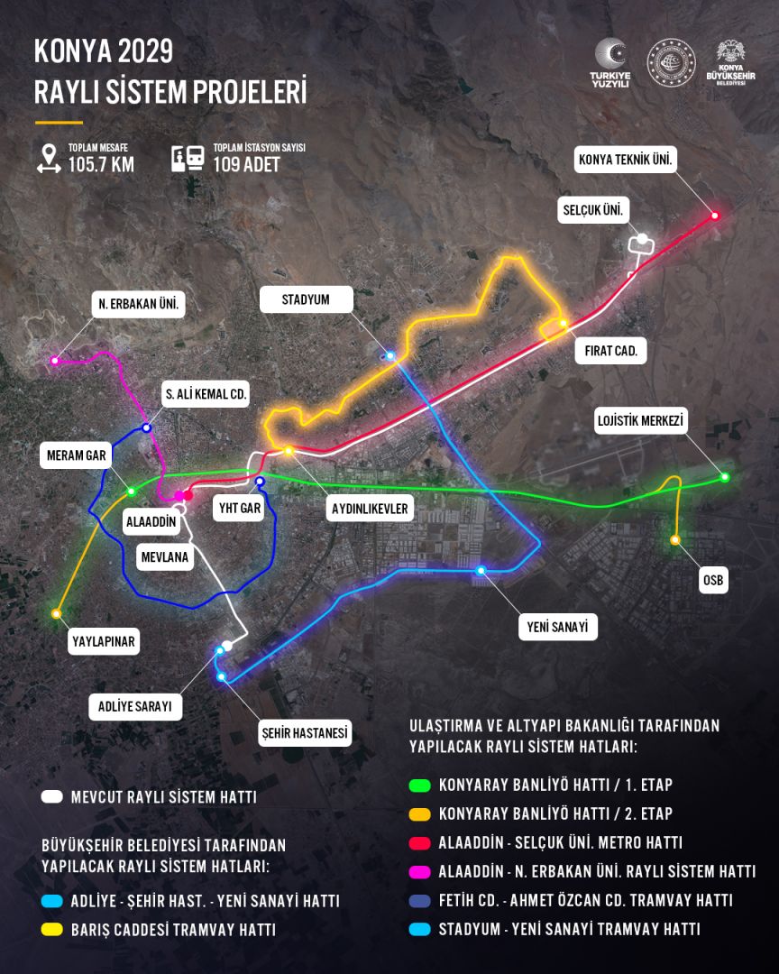 “İlk etapta temelini attığımız çalışmayla, Şehir Hastanesi’nden başlayıp Aslım Caddesi’nden devam eden 11.2 kilometrelik hattın yapımını Büyükşehir olarak üstlenmiş bulunuyoruz. Bugün protokolünü yapacağımız ikinci etapta ise; Yeni Sanayi Sitesi’nden başlayarak Aslım Caddesi-Aksaray Yolu kavşağı-Dr. Sadık Ahmet Caddesi-Halil Ürün Caddesi ve Yeni Stadyuma kadar olan hattı bakanlığımız yapacak. Bu hatla birlikte Barış Caddesi’nde Büyükşehir Belediyemizin yapacağı hat, Selçuk Üniversitesi hattı, KONYARAY’ı dik kesen ve Eski Sanayi ve Karatay Sanayi’yi taşımamızla oluşacak yeni sanayi alanı ve Aslım Caddesi’ndeki bütün sanayi alanlarının taşınmasına yardımcı olacak bir toplu taşıma hattını ortaya koymuş olacağız. Devredeceğimiz ikinci etap hattın uzunluğu 10 kilometre. İnşallah tamamlandığında Yeni Stadyumdan başlayarak Şehir Hastanesi’ne kadar 21.1 kilometrelik yeni raylı sistem hattına kavuşmuş olacağız.”