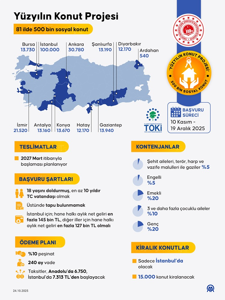 Afetlere dirençli 500 bin yeni yuvayı milletin istifadesine sunacaklarını dile getiren Erdoğan, "Başvurular 15 Kasım 2025 tarihinde başlıyor. Başvurularla birlikte inşaat çalışmalarının da startını vereceğiz. Kuraları bu yılın aralık ayında çekiyoruz. İlk teslimleri ise Mart 2027'de, Allah'ın izniyle gerçekleştireceğiz." dedi.