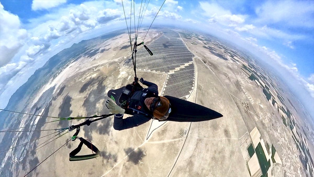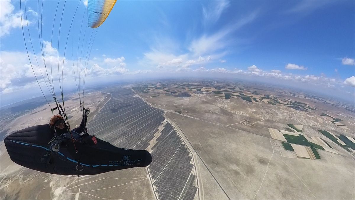 Karapınar Uçuş ve Doğa Sporları Kulübü Başkanı Mustafa Ulutaş, büyüklüğüyle dikkati çeken santral üzerinde yamaç paraşütüyle uçuş gerçekleştirdi.