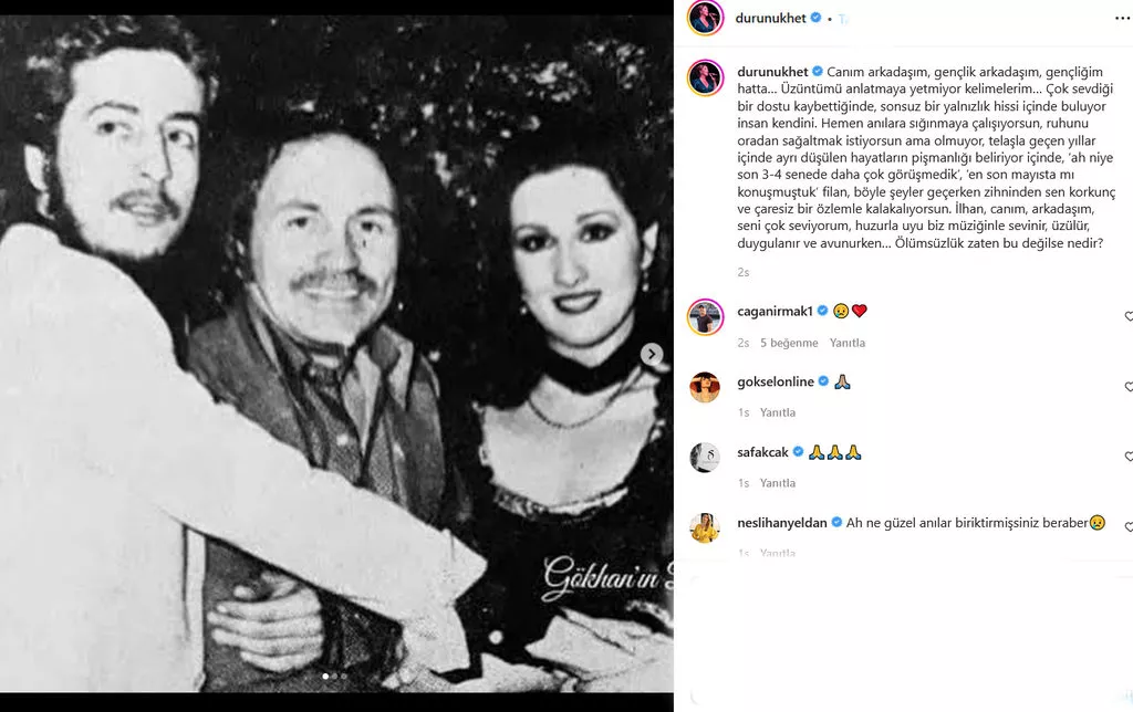 "Canım arkadaşım, gençlik arkadaşım, gençliğim hatta… Üzüntümü anlatmaya yetmiyor kelimelerim… Çok sevdiği bir dostu kaybettiğinde, sonsuz bir yalnızlık hissi içinde buluyor insan kendini. Hemen anılara sığınmaya çalışıyorsun, ruhunu oradan sağaltmak istiyorsun ama olmuyor, telaşla geçen yıllar içinde ayrı düşülen hayatların pişmanlığı beliriyor içinde, ‘ah niye son 3-4 senede daha çok görüşmedik’, ‘en son mayısta mı konuşmuştuk’ filan, böyle şeyler geçerken zihninden sen korkunç ve çaresiz bir özlemle kalakalıyorsun. İlhan, canım, arkadaşım, seni çok seviyorum, huzurla uyu biz müziğinle sevinir, üzülür, duygulanır ve avunurken… Ölümsüzlük zaten bu değilse nedir?"