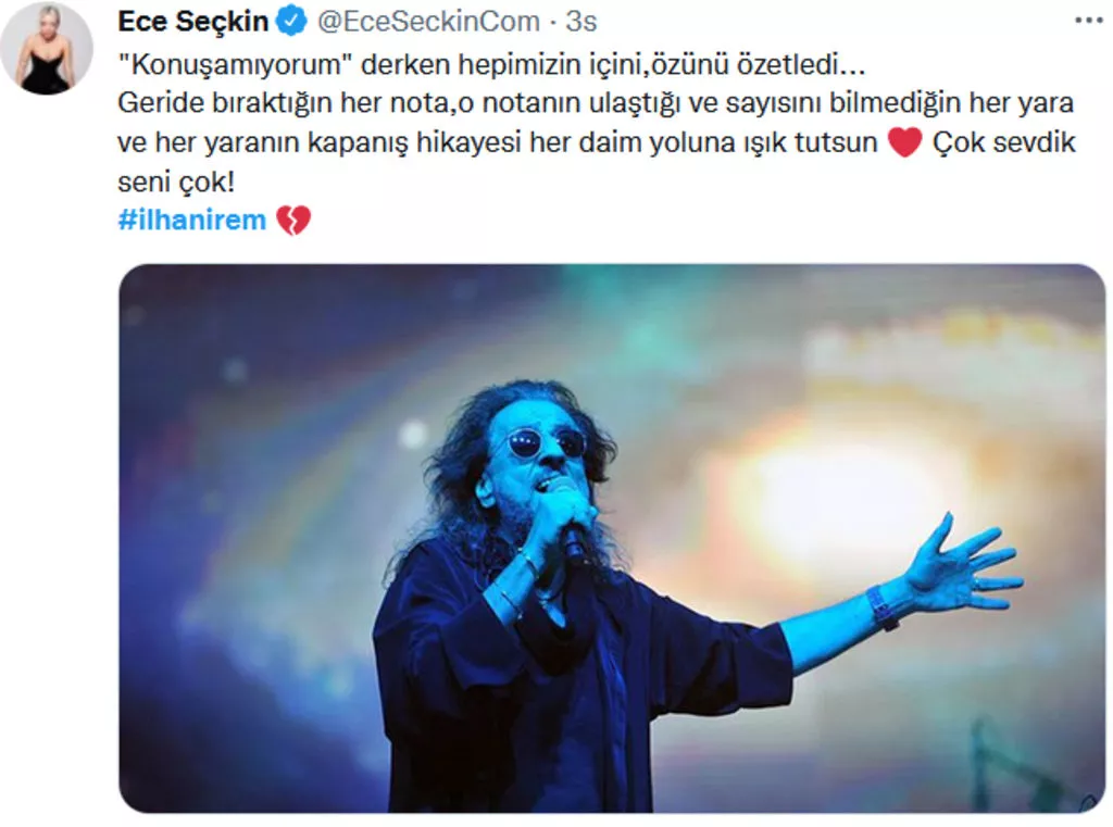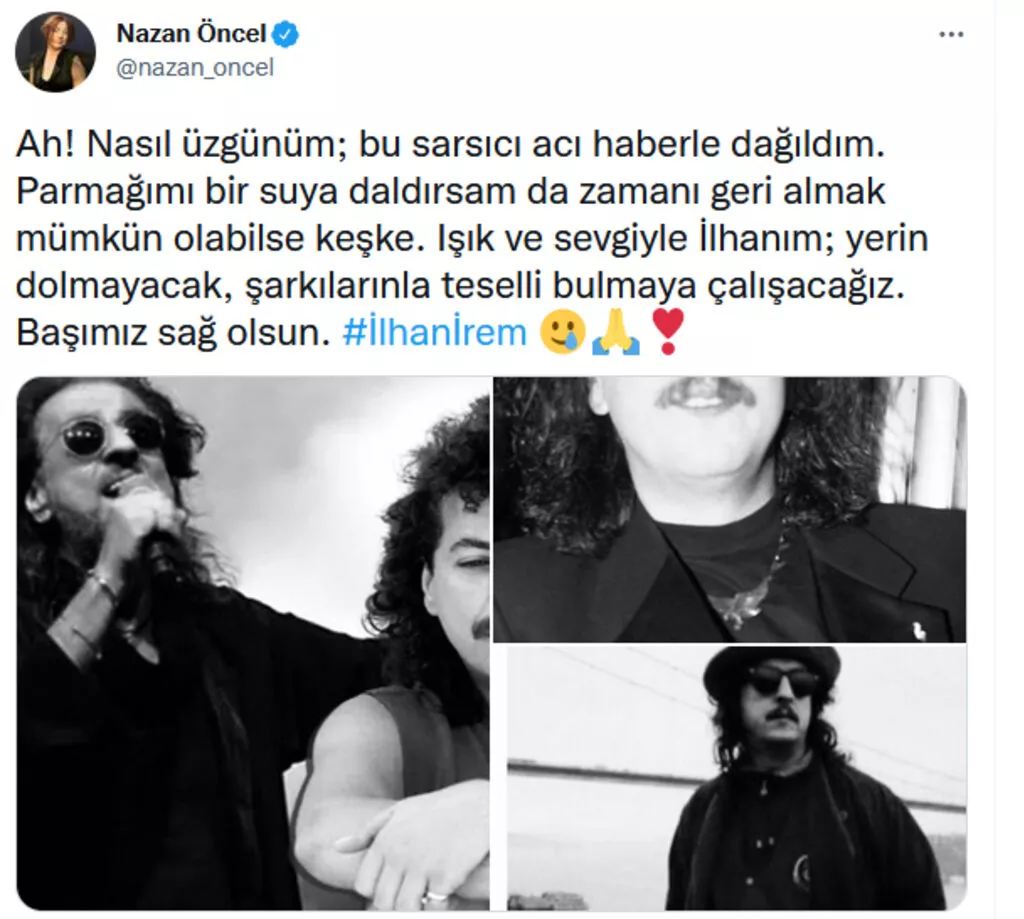 "Ah! Nasıl üzgünüm; bu sarsıcı acı haberle dağıldım. Parmağımı bir suya daldırsam da zamanı geri almak mümkün olabilse keşke. Işık ve sevgiyle İlhanım; yerin dolmayacak, şarkılarınla teselli bulmaya çalışacağız. Başımız sağ olsun."