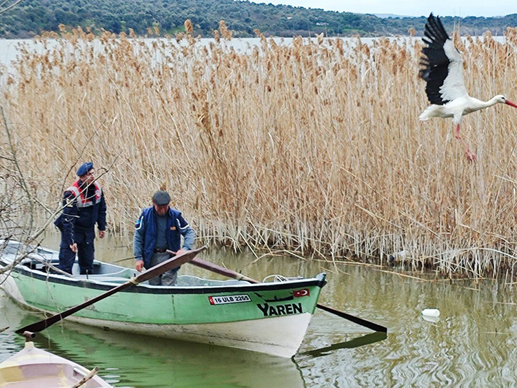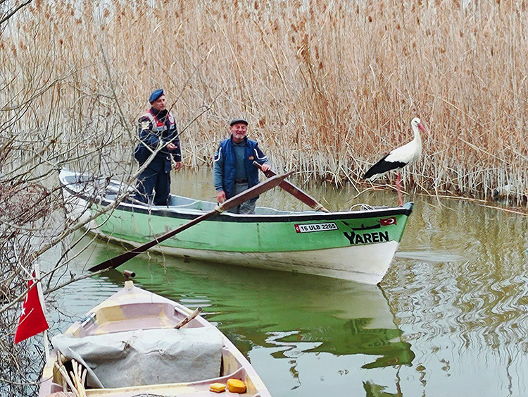 Bursa'nın Karacabey ilçesinde, kayıkla açılıp Uluabat Gölü'nde balık tutan İl Jandarma Komutanlığı ekipleri, Adem Yılmaz ile kurduğu dostlukla tanınan "Yaren" leyleği besledi.