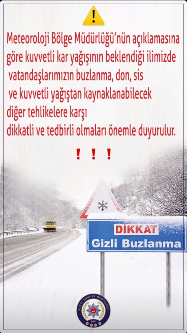 Konya Emniyet Müdürlüğü Bölge Trafik Denetleme Şube Müdürlüğü ve İlçe İstasyon Amirlikleri ekiplerinden alınan karayollarında 4 Şubat 2023 Cumartesi son yol ve hava durumu bilgilerini paylaştı.