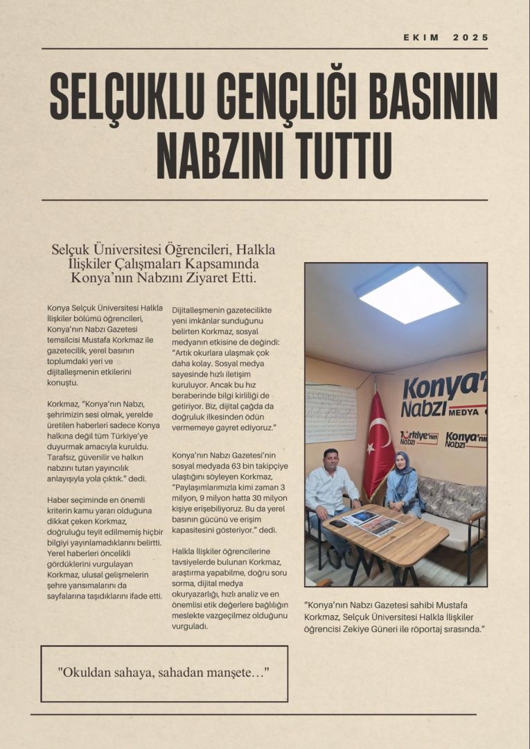 Konya Selçuk Üniversitesi Halkla İlişkiler bölümü öğrencileri, Konya’nın Nabzı Gazetesi İmtiyaz Sahibi Mustafa Korkmaz ile gazetecilik, yerel basının toplumdaki yeri ve dijitalleşmenin etkilerini konuştu.