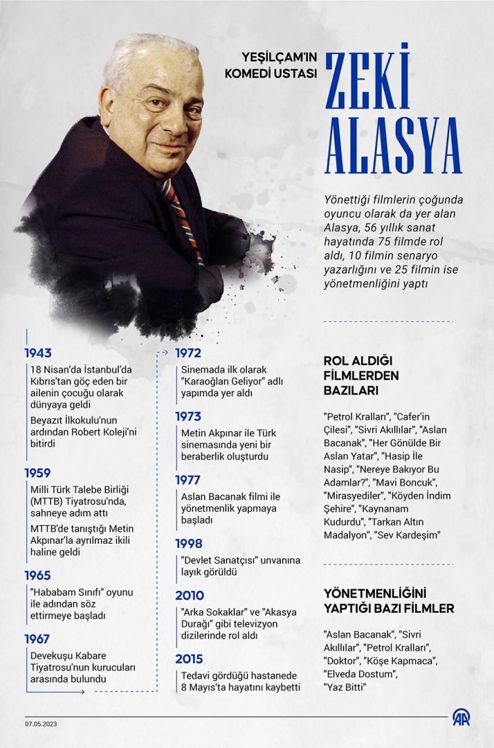 Kariyeri boyunca 56 yılda çok sayıda tiyatro, film ve dizide rol alan Yeşilçam'ın duayen oyuncularından Zeki Alasya'nın vefatının üzerinden 8 yıl geçti.